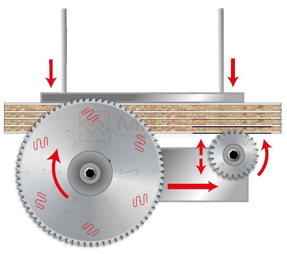 To size bilaminated panels with the employment of the scoring saw blade, in detail melamine-coated panels, with good finishing and long cutting life.